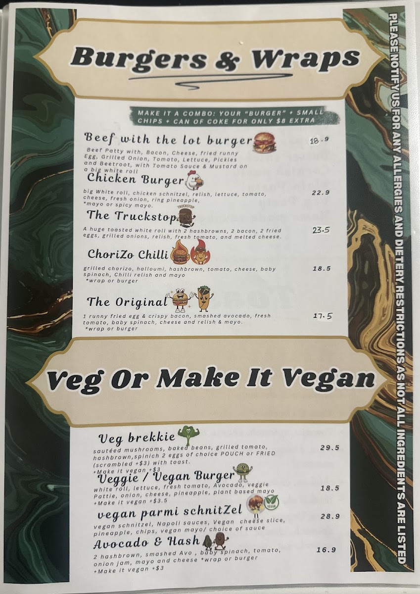 100% beef patty with house seasoning, bacon, cheese, egg, grilled onion, tomato, lettuce, pickles and beetroot, tomato sauce & mustard. Try adding a Hash Brown from extras for a monster feed!