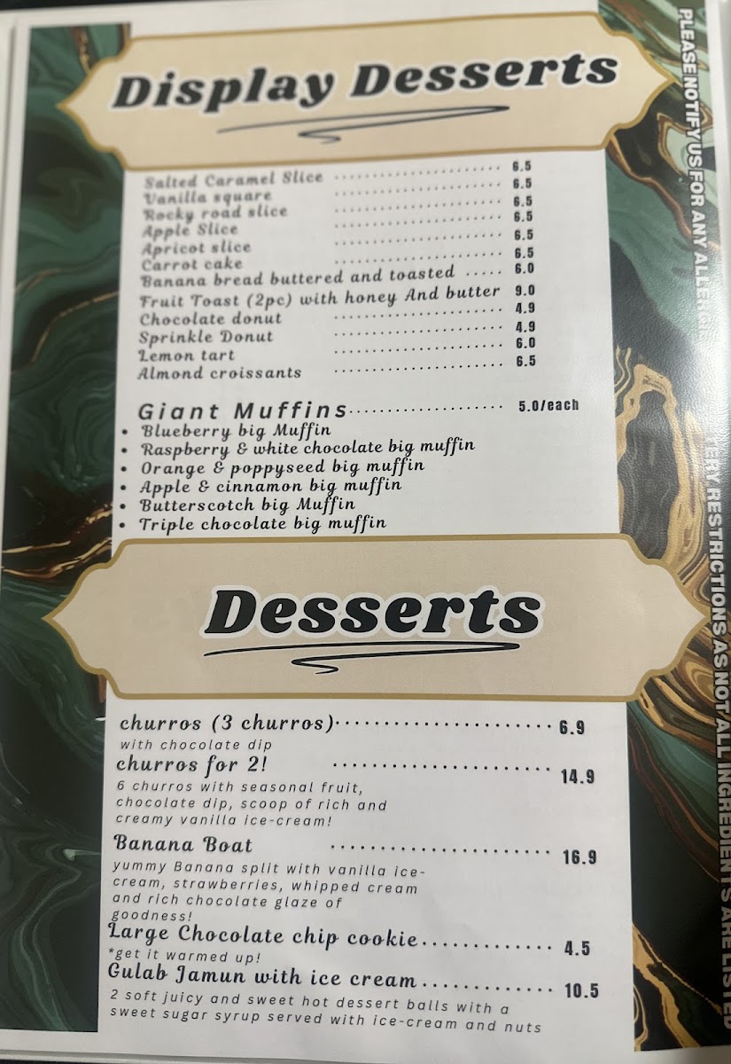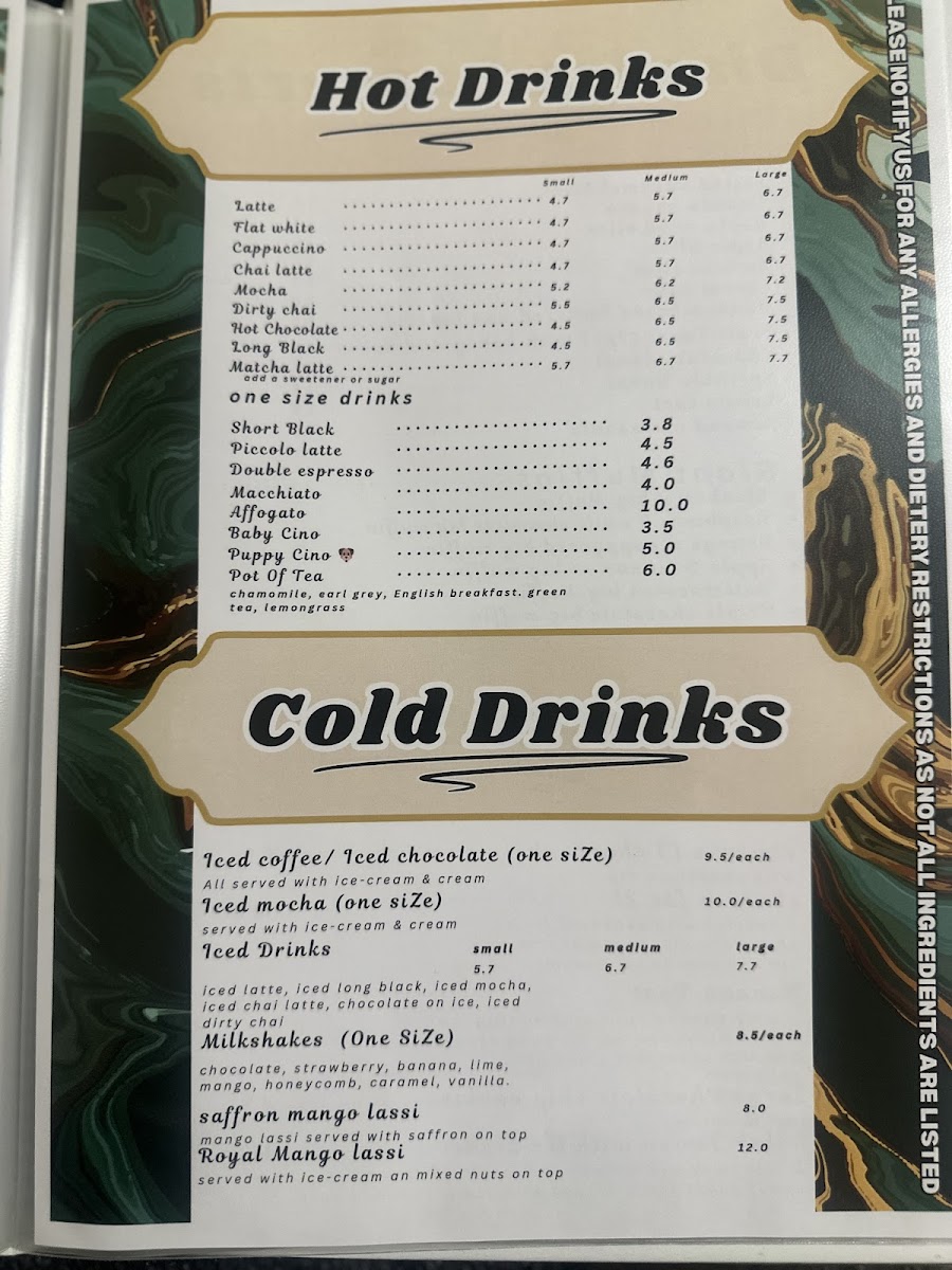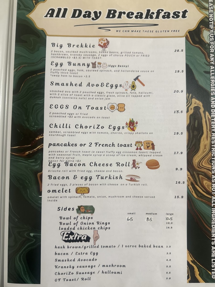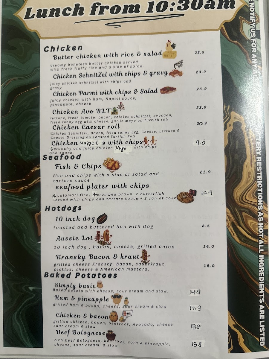 For something more substantial, the menu delivers hearty comfort food through Aussie Lot Hotdog, 10" Hotdog, and Kransky Bacon & Kraut Dog, alongside satisfying hot meals such as Chicken Schnitzel And Gravy, Butter Chicken With Rice And Salad, Chicken Parmy And Chips, and seafood staples like Fish And Chips With Salad or Seafood Plater With Chips. The all-day breakfast selection, featuring Eggs On Toast, Omelet, The Big Breakfast, and Egg And Bacon Turkish Roll, reinforces the cafe’s strength as a reliable breakfast and brunch destination.